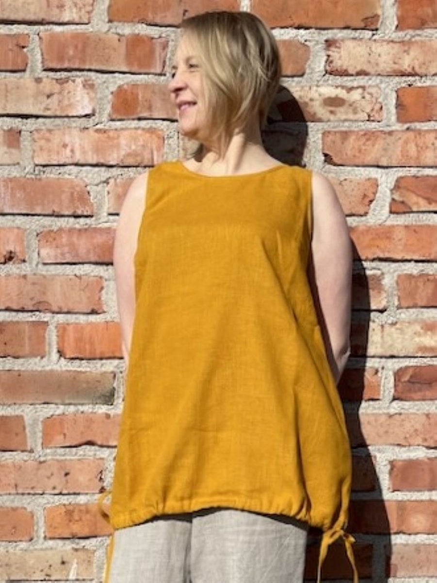 Måtten är det färdiga plaggets mått i centimeter. Linnetyg stretchar inte, så vi rekommenderar att du väljer en storlek med tillräcklig rörelsevidd (rekommendation ca 8–12 cm extra utöver ditt bröstmått). Tyget är förtvättat före sömnad, så det krymper inte i hemvätt.